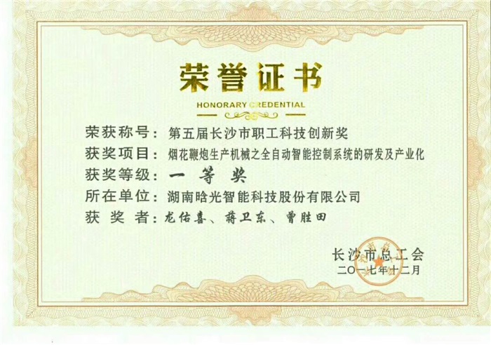 热烈祝贺球友会体育(中国)官方网站智能的研发项目获长沙市科技创新一等奖,项目技术带头人龙佑喜先生获长沙市五一劳动者奖章。