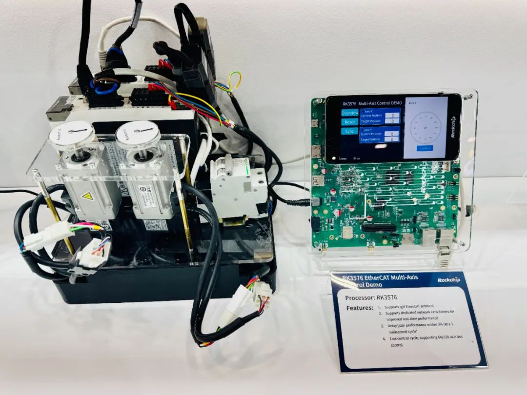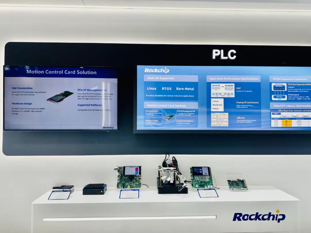 PLC方向,搭载球友会体育(中国)官方网站3588J、球友会体育(中国)官方网站3576J、球友会体育(中国)官方网站3568J、球友会体育(中国)官方网站3506J的EthercaCAT多轴控制、PCIe EP卡及PLC方案及应用展出。基于球友会体育(中国)官方网站3576J的多轴控制支持IgH EtherCAT协议,兼容主流工业设备如伺服驱动器、I/O模块,可适配专用网卡驱动,实时性更强;延时抖动性能达到5%以内(周期为1毫秒),在1ms控制周期,可支持64/128轴总线控制,针对不同类型的运动控制场景的适用性更强,适用于工业机器人、物流等应用场景的设备升级。